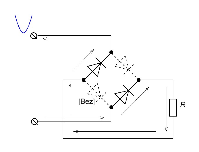 Как вы видите, при положительной полуволне не задействованы диоды, которые я показал штриховой линией.