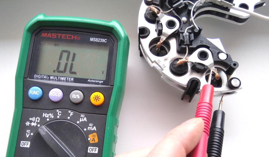 В каждом хорошем мультиметре есть функция прозвонки диодов. Как я уже говорил, наш автомобильный диодный мост будет исправен, если все его диоды будут исправны.