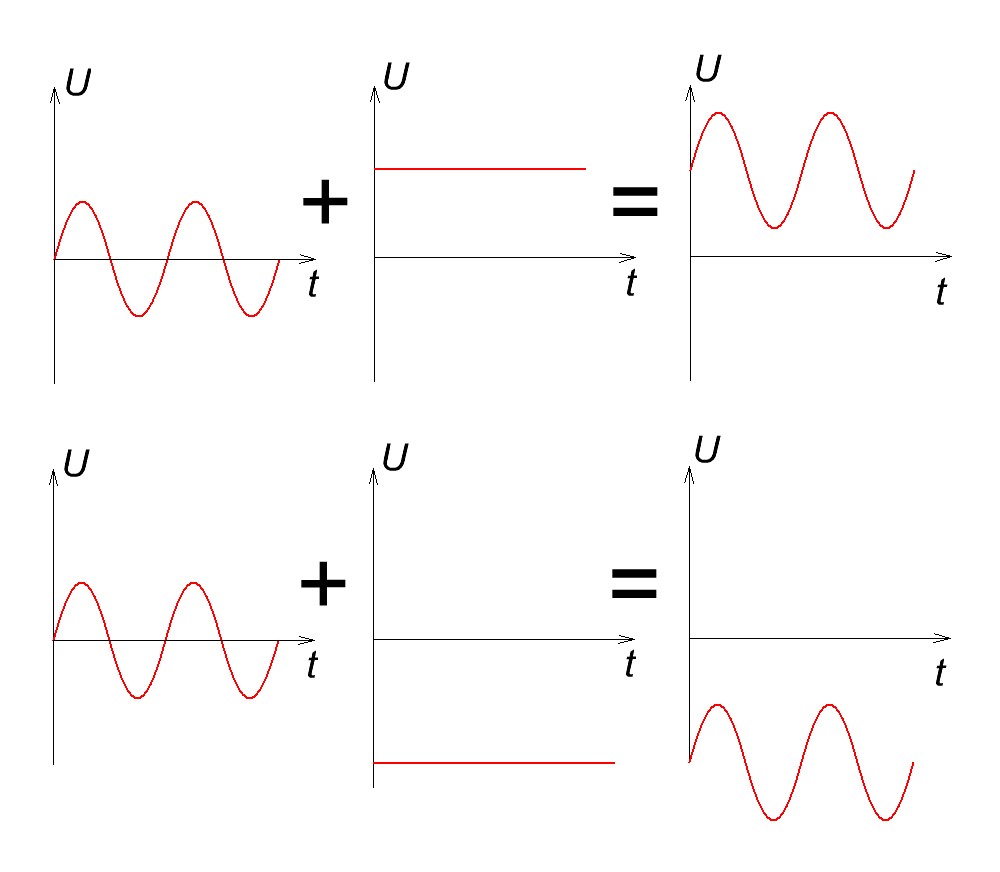 Смысл этой операции заключается в том, что к переменному току мы добавляем постоянный ток. Если объяснить графически, то это будет выглядеть вот так.