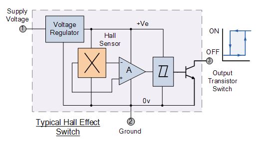 Но здесь один маленький нюанс. Дело в том, что напряжение Холла даже при самой большой напряженности магнитного поля будет какие-то микровольты. Согласитесь, это очень мало. Поэтому, помимо самой пластинки в датчик Холла устанавливают усилители постоянного тока, логические схемы переключения, регулятор напряжения а также триггер Шмитта. В самом простом переключающем датчике Холла все это выглядит примерно вот так: