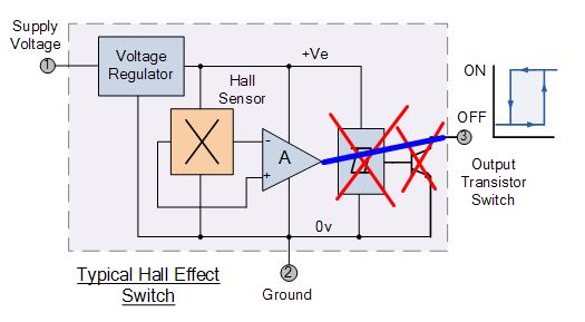 В линейных датчиках Холла выходное напряжение берется сразу с операционного усилителя. То есть в линейных датчиках вы не увидите триггер Шмитта, а также выходного переключающего транзистора. То есть все это будет выглядеть примерно вот так: