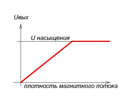 Как вы видите, до какого-то момента у нас идет линейная зависимость выходного напряжения датчика от плотности магнитного потока. Дальнейшее увеличение магнитного потока бесполезно, так как оно достигло напряжения насыщения, которое ограничено напряжением питанием самого датчика Холла.