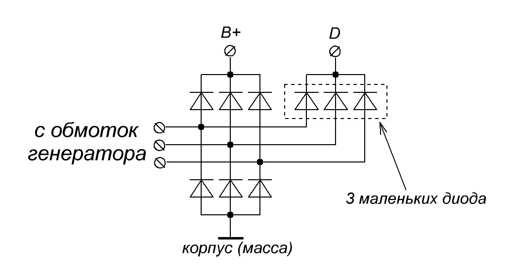 Диодный мост генератора в автомобилях выпрямляет переменное напряжение, которое поступает от обмоток статора генератора. То есть грубо говоря, без диодного моста получается трехфазный мини-генератор.