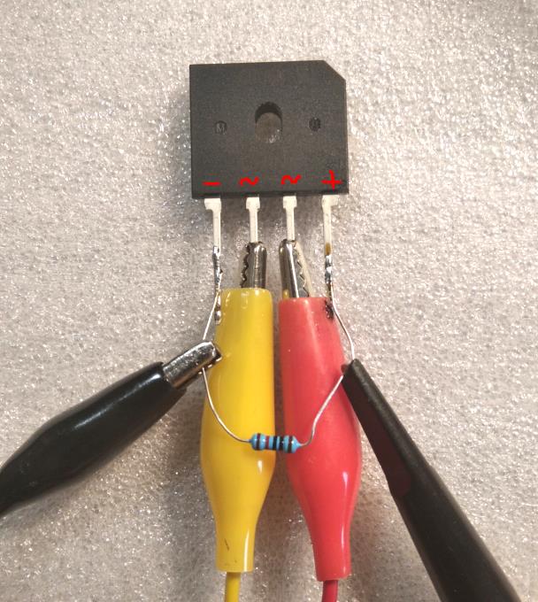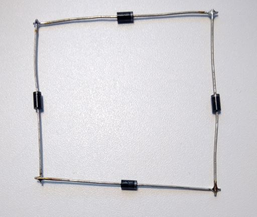 Давайте и мы посмотрим, что получается на выходе диодного моста, если подать на него переменное напряжение. Для этого возьмем 4 простых кремниевых диода и соединим их в диодный мост. Важно, чтобы диоды были одной марки.