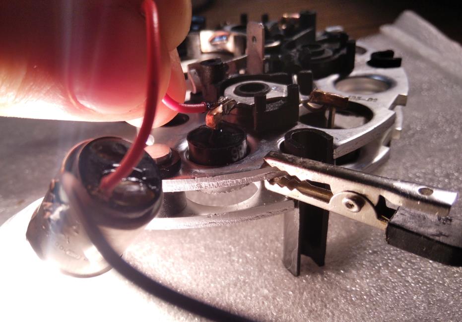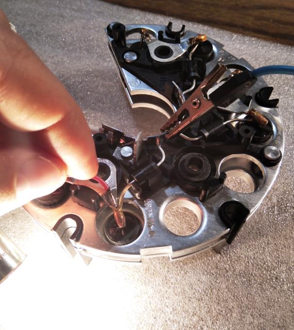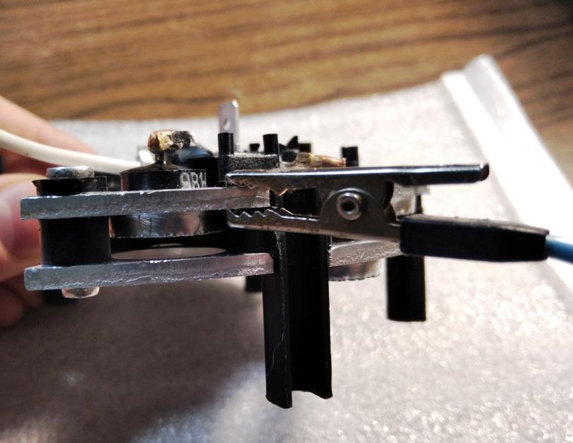 Поехали! У нас имеется 9 диодов. Начнем, пожалуй, с больших диодов-таблеток, которые вмонтированы в металлические пластины. Цепляюсь одним выводом-крокодилом к пластине, на которой вмонтирован один конец диода