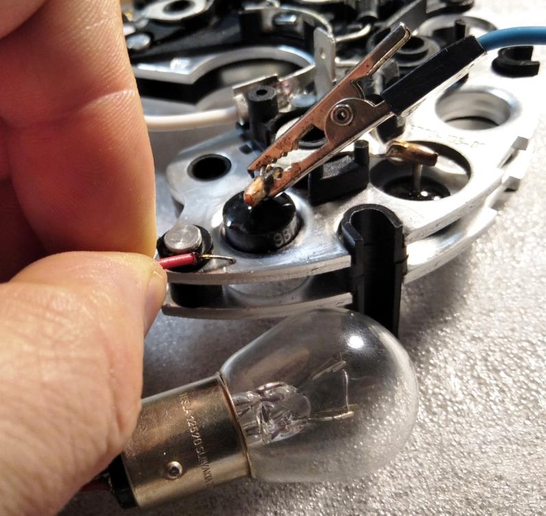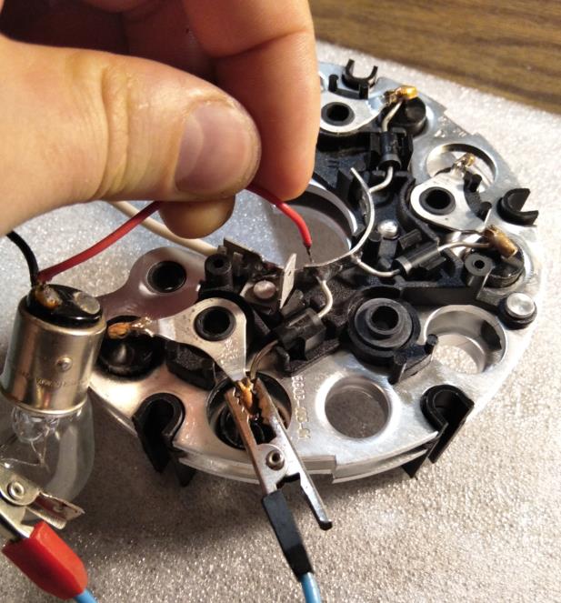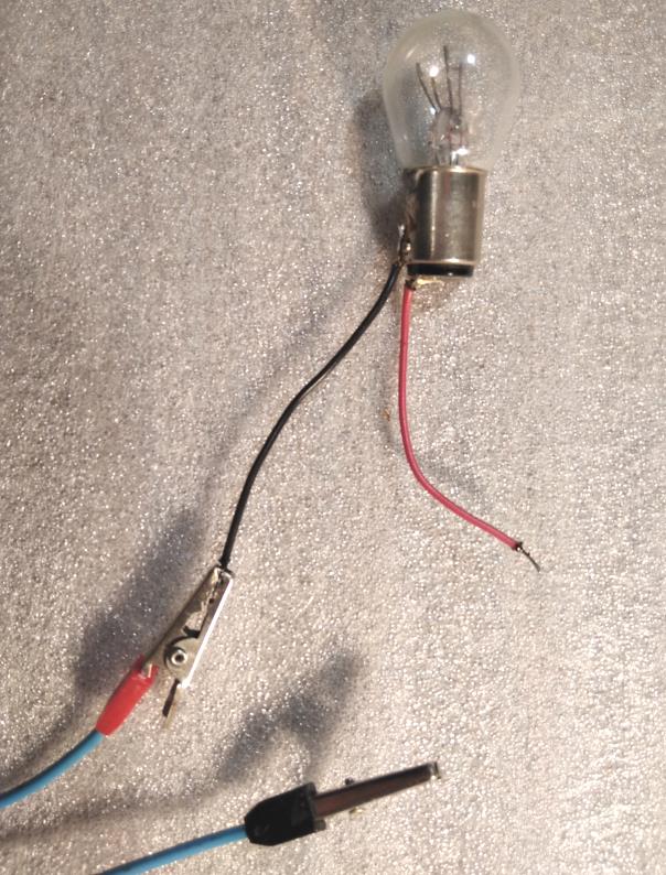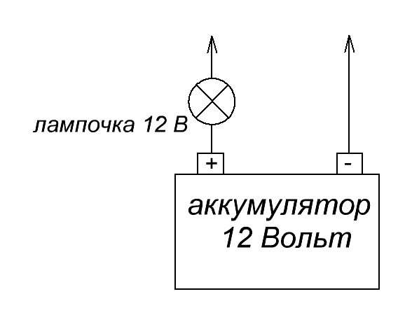 Предварительно лучше запаять или прикрепить к лампе два провода, чтобы было проще производить проверку. Итак, собираем наш прибор для проверки диодного моста генератора из лампы и аккумулятора вот по такой схеме.