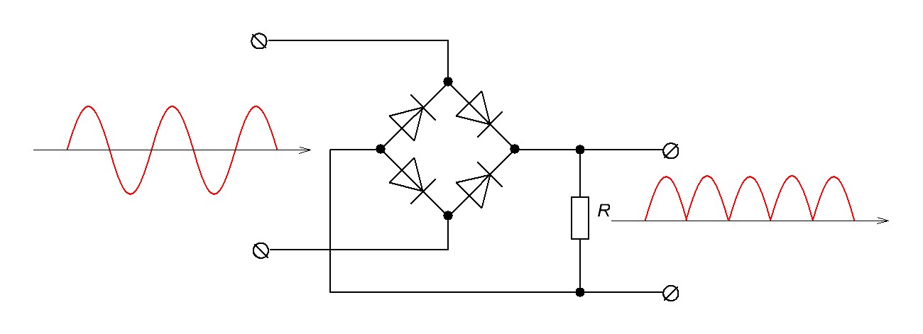 Как вы видите, на вход диодного моста мы подаем переменное напряжение, а на выходе диодного моста снимаем постоянное напряжение. Отсюда можно сделать вывод: