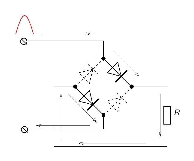Как вы видите, при положительной полуволне не задействованы диоды, которые я показал штриховой линией.