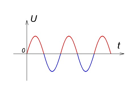 Как вы знаете, переменный ток меняет свое направление несколько раз в секунду. Поэтому, его можно разбить на положительные полуволны и отрицательные полуволны. Положительные полуволны я пометил красным, а отрицательные — синим.