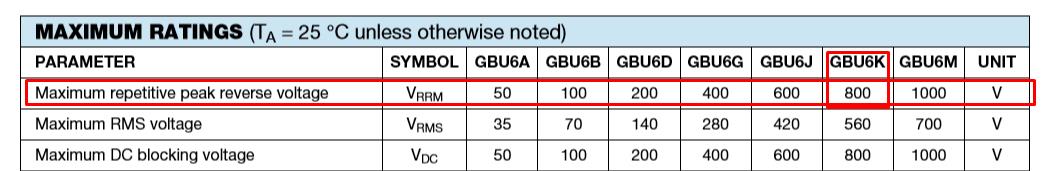 Грубо говоря, это обратное напряжение диода. Если его превысить, то произойдет пробой и диоду, а следовательно и диодному мосту, придет «кирдык». Этому параметру также следует уделять внимание, когда вы будете выпрямлять сетевое напряжение. Если вы будете подавать на диодный мост 220 Вольт, то его пиковое значение будет составлять 310 Вольт (220 × √2). Так как у меня диодный мост GBU6K, то надо смотреть табличку ниже. Как вы видите, пиковое обратное напряжение диодов составляет 800 Вольт. Значит, такой диодный мост вполне подойдет для выпрямления сетевого напряжения.
