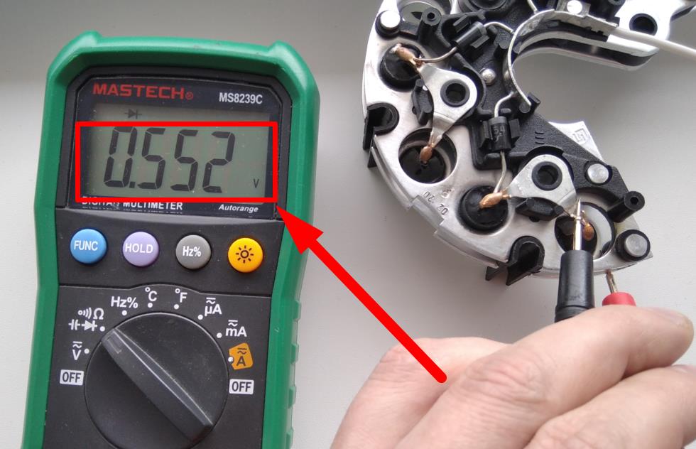И начинаем проверять все диоды друг за другом на исправность. В одном направлении диод должен показать значение от 0,4 и до 0,7 Вольт. В нашем случае 0,552 Вольта, что вполне приемлемо.