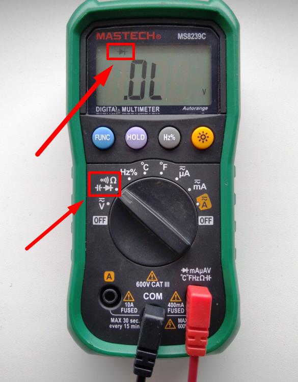 Берем в руки мультиметр и ставим его в режим прозвонки диодов.