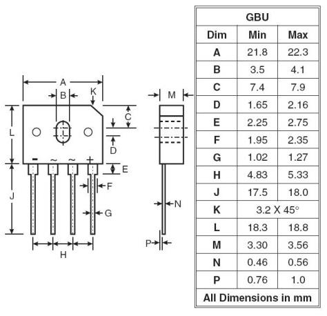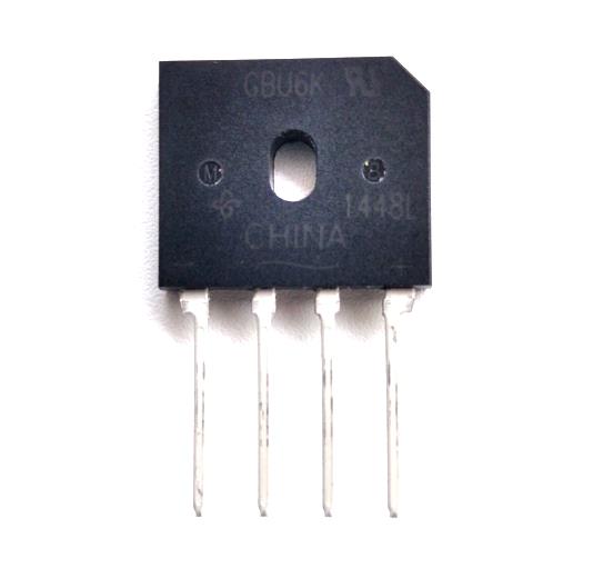 Как вы теперь знаете, однофазный диодный мост состоит из 4 диодов. Для того, чтобы узнать их расположение, мы должны скачать даташит на данный диод и посмотреть, как расположены диоды в данном диодном мосте. Например, для моего моста GBU6K диоды расположены вот так.