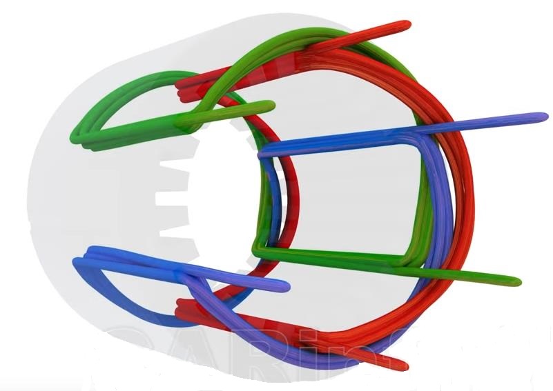 Далее в эти пазы наматывается медный лакированный провод определенным образом, который представляет из себя обмотки статора