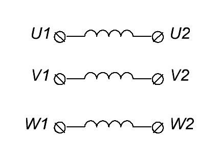 Как мы уже с вами узнали, асинхронный двигатель имеет три обмотки. На современный манер они обозначаются английскими буквами U,V,W. Начало каждой обмотки обозначается цифрой «1», а конец обмотки цифрой «2».