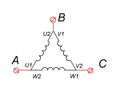 Соединение «треугольник» выполняется по схеме: конец первой обмотки соединяется с началом второй, конец второй – с началом третьей, а конец третьей – с началом первой. В места соединения подается питающее трехфазное напряжение.
