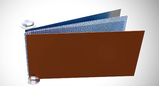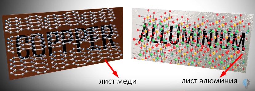 В реальных литий-ионных аккумуляторах графит и оксид лития наносятся в виде покрытия на медную и алюминиевую фольгу. Ниже на рисунке мы видим, что на тонком листе меди у нас располагается графит, а на тонком листе алюминия — оксид лития.