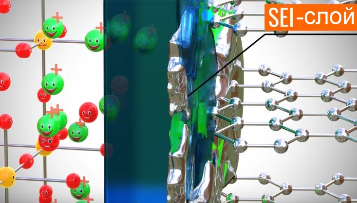 Во время первой зарядки внутри литий-ионного элемента происходит одно замечательное явление, спасающее элемент от скорой «смерти». Неожиданной проблемой оказались электроны, находящиеся в слое графита. При контакте с электролитом они начинают разрушать его. Но одно случайное открытие позволило не допустить контакт электронов с электролитом. При первой зарядке элемента, как мы уже говорили, ионы лития движутся сквозь электролит. В процессе этого движения молекулы растворенного в электролите вещества покрывают ионы. Достигнув графитового слоя, ионы лития вместе с молекулами раствора электролита реагируют с графитом, образуя так называемая промежуточную фаза твердого электролита (solid electrolyte interphase, или SEI-слой). Этот слой предотвращает контакт электронов с электролитом, предохраняя электролит от разрушения.