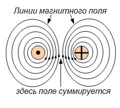 Как вы можете заметить, в области, где суммируются магнитные силовые линии плотность магнитного потока прям зашкаливает.