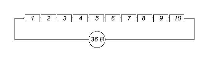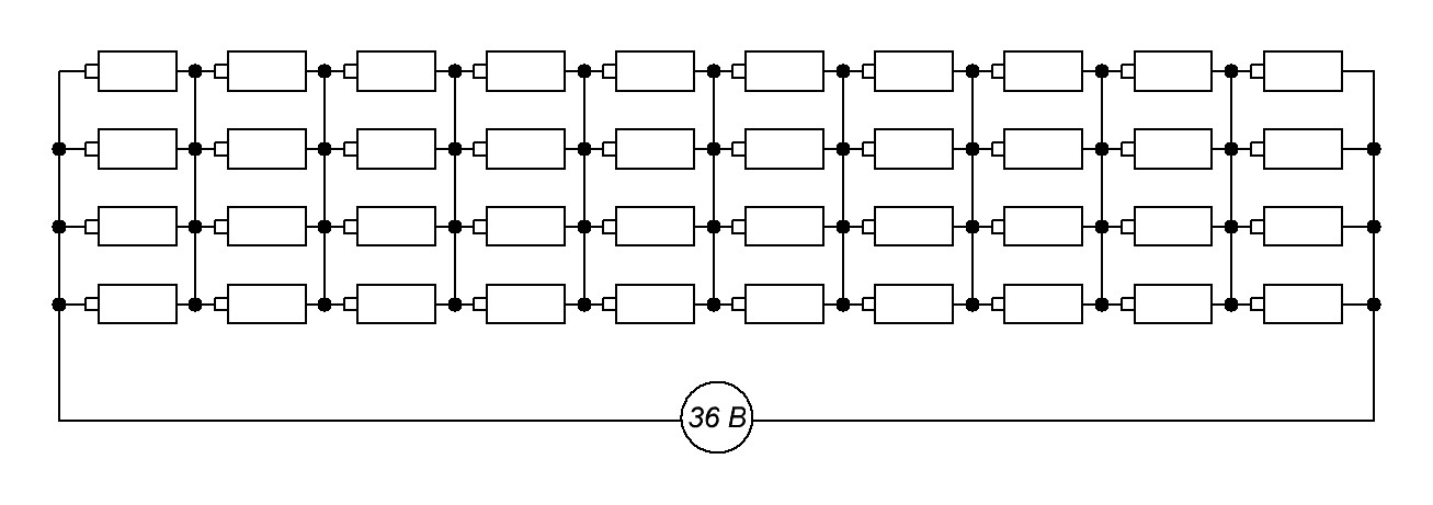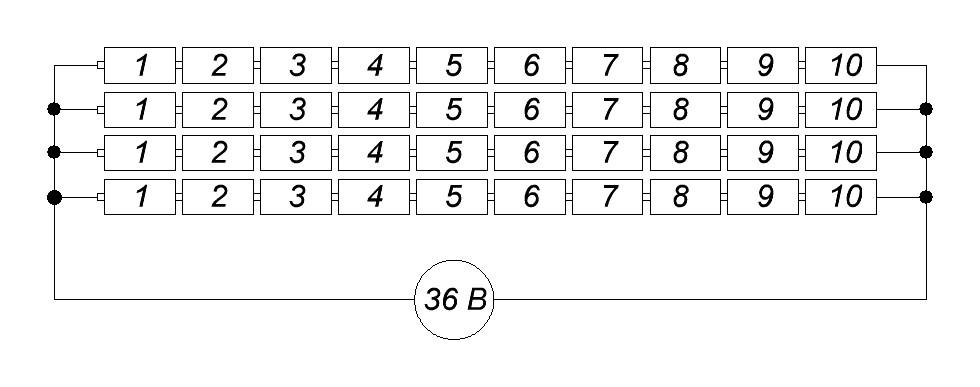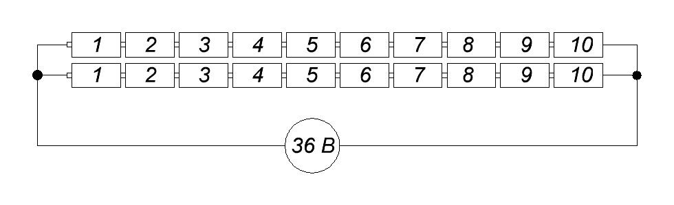 Сказано — сделано. Цепляем еще одну ветвь в 36 Вольт. Вы ведь не забыли правило, что при параллельном соединении у нас напряжение должно быть одинаково? В результате мы получаем что-то типа этого: