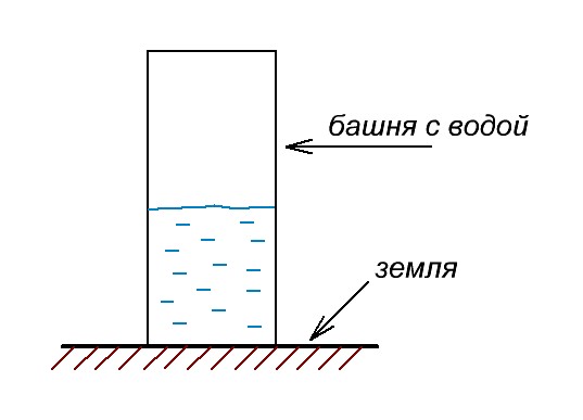 Давайте отпилим у водобашни верхнюю часть для наглядности. У нас получится цилиндр, который заполнен водой. Возьмем за точку отсчета уровень земли. Пусть он у нас будет равняться нулю.