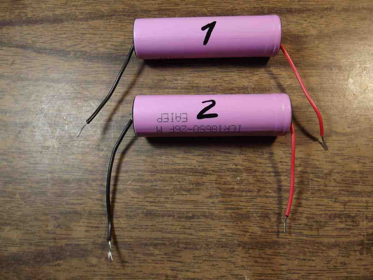 Давайте все это продемонстрируем на практике. Итак, у нас есть 2 литий-ионных аккумулятора. Я их пометил цифрами 1 и 2. С плюса каждого аккумулятора я вывел красный провод, а с минуса — черный.