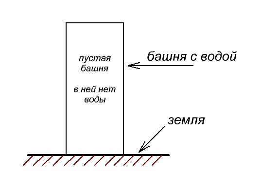 Да, все оно так, но здесь важное значение имеет именно то, что давление на дно башни изменилось и стало также в два раза больше. Если сделать врезку одинакового диаметра прямо у подножия водобашни, то  в случае, когда водобашни стоят одна на другой сила потока воды будет в два раза быстрее, чем если бы мы делали точно такую же врезку на картинке, где мы соединяли водобашни трубой. Более подробно эту мысль я еще озвучивал в статье про Закон Ома.