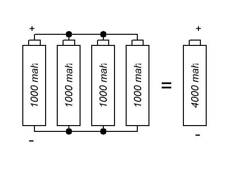 Если всю эту мысль спроецировать на наши источники питания, то получается, что при последовательном соединении у нас суммировалась напряжение, а при параллельном должна суммироваться сила тока. Но это не значит, что нагрузка, которая кушала, к примеру, 1 Ампер, после того, как мы ее цепанем к двум параллельным источникам питания, будет кушать 2 Ампера. При параллельном соединении у нас напряжение остается таким же, а вот емкость батарей увеличивается. Но нагрузка все равно будет кушать тот же самый 1 Ампер, иначе бы все это противоречило закону Ома.