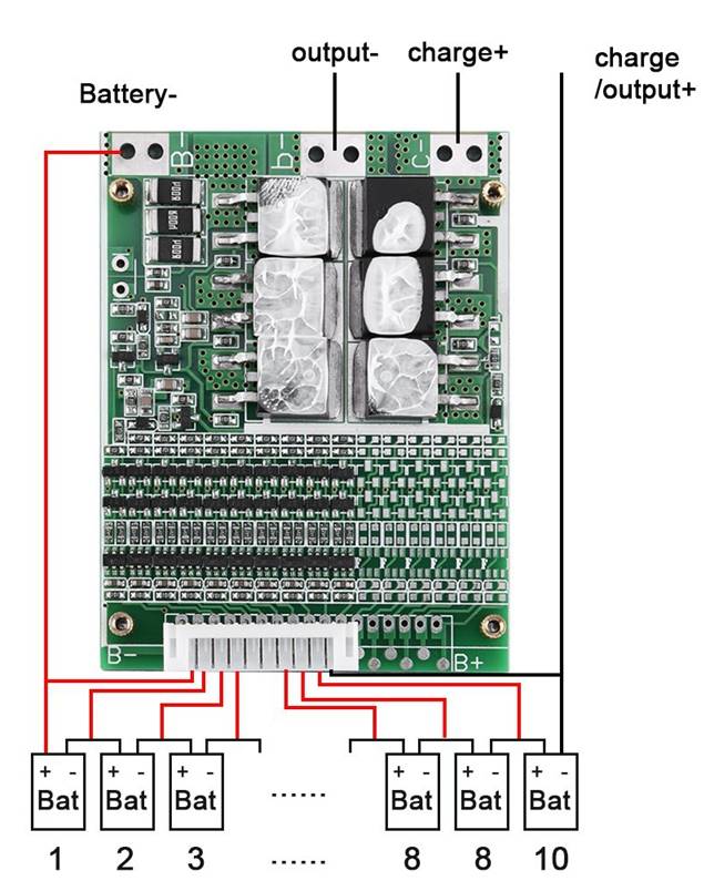 10S 36V на BMS говорит нам о том, что эта BMS рассчитана для 10 аккумуляторов, включенных последовательно. Если на каждом аккумуляторе будет по 3,6 В, следовательно, 10х3,6=36 Вольт что и написано на самой BMS.